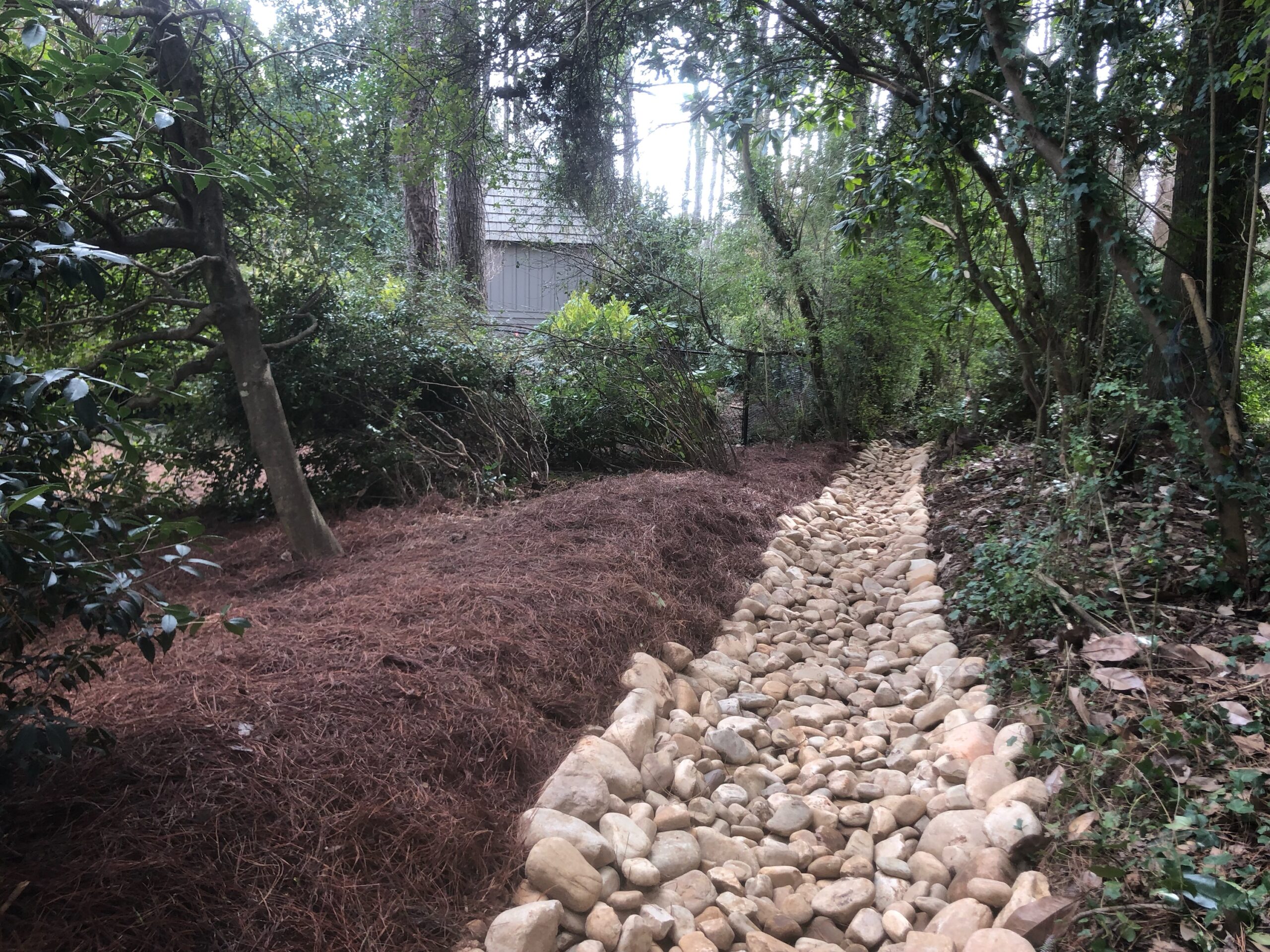 Austell’s clay-heavy soil and significant rainfall make proper drainage essential. Our stormwater management and drainage solutions eliminate standing water, prevent foundation damage, and protect your landscape investment. We design and install French drains, channel drains, dry creek beds, and grading solutions that redirect water away from your home and landscape features.